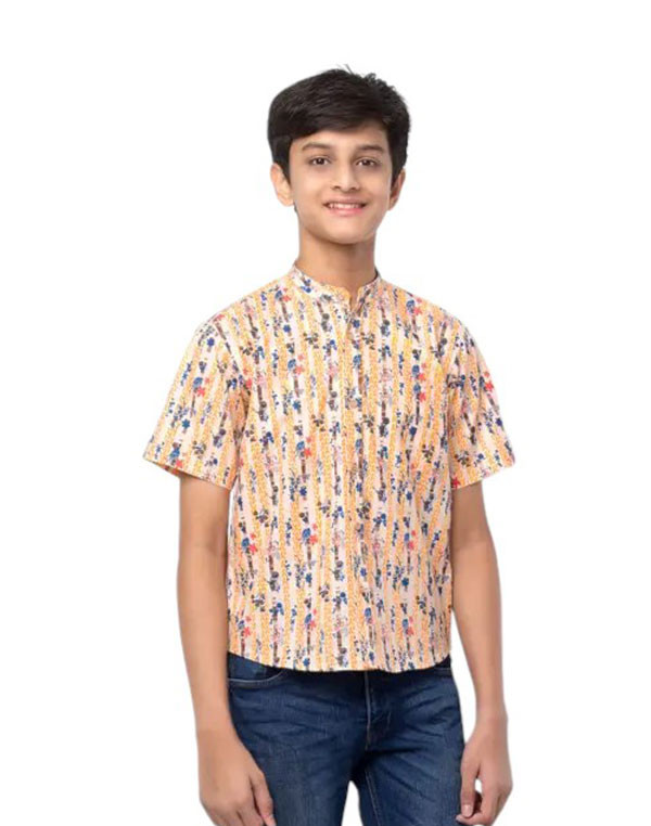Apricot cotton shirt with multicolour prints. Features chest pocket.