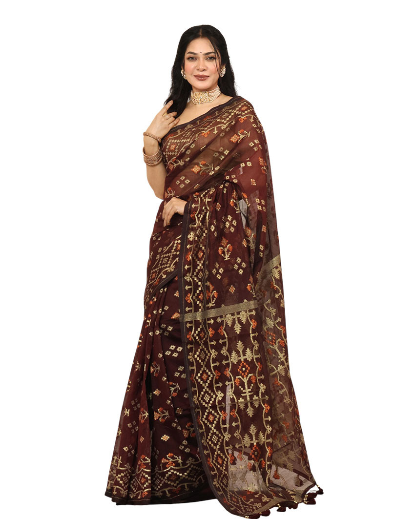 Elegant silk Jamdani sharee for women featuring an attractive, intricate design. Luxurious, lightweight, and comfortable, perfect for weddings, festive occasions, or special celebrations.
