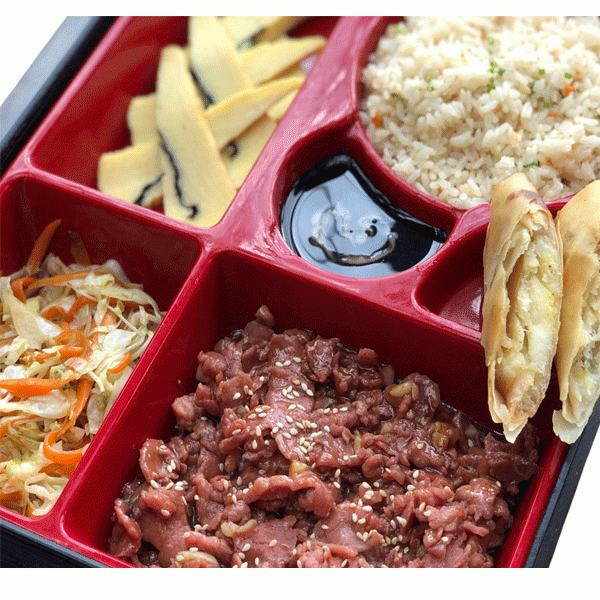 • 1:1 - Consists of beef strips, vegetable fried rice, side's of saute vegetable, tamago & banana spring roll.