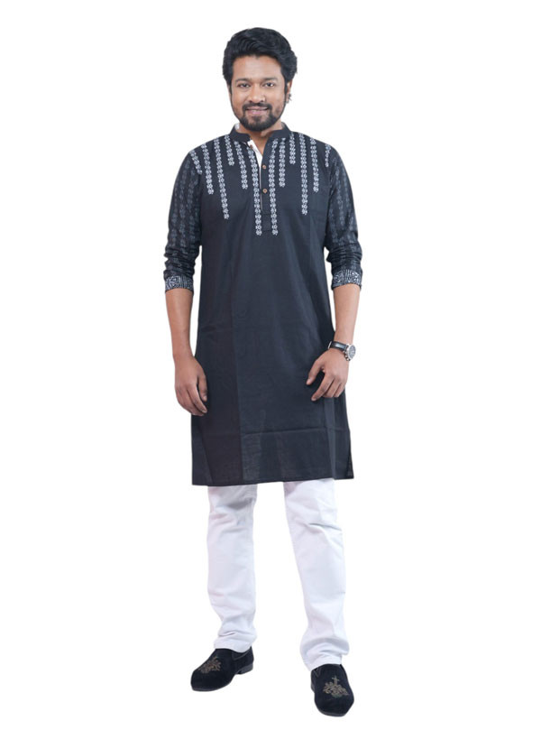 Short Panjabi - Block Printed Black Color Cotton Panjabi