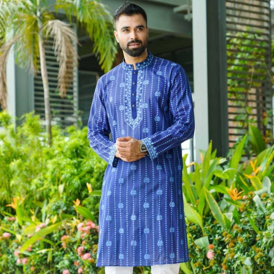 Short Panjabi - Blue colour printed & embroidered cotton Panjabi