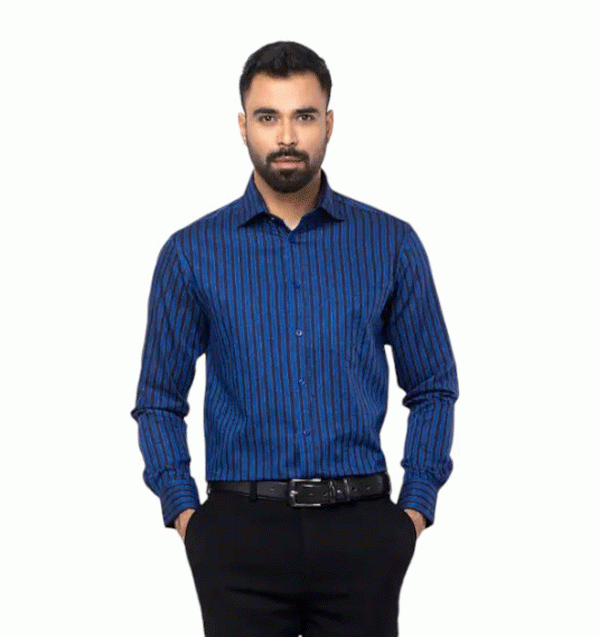 Shades of blue stripe printed mixed cotton executive shirt. Features chest pocket and standard placket. This shirt is suitable for a range of semi-formal occasions, from important business meetings to elegant evening events.