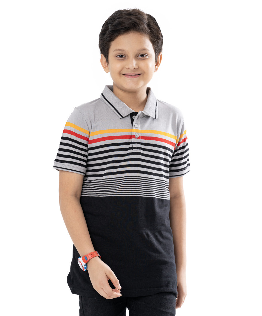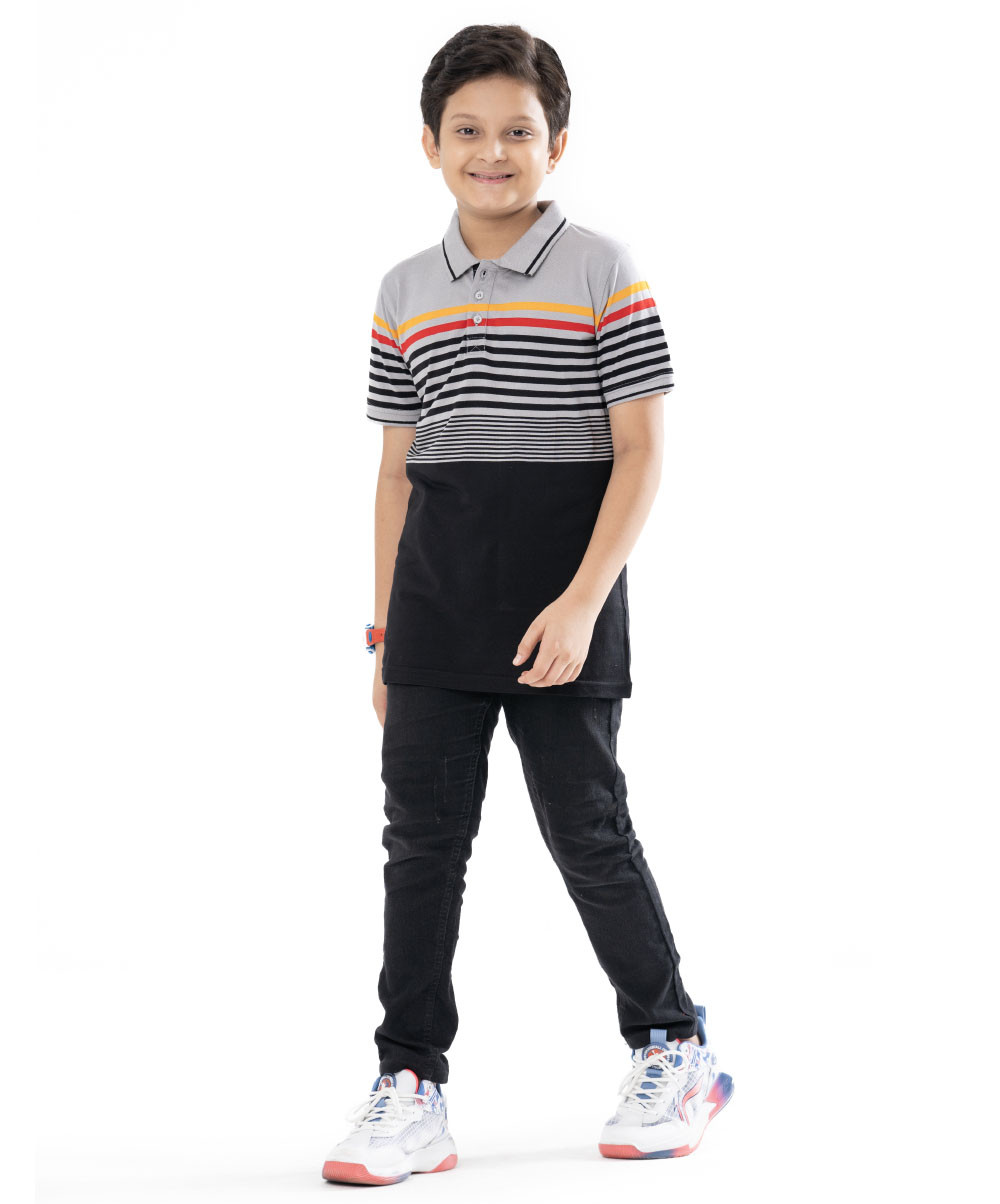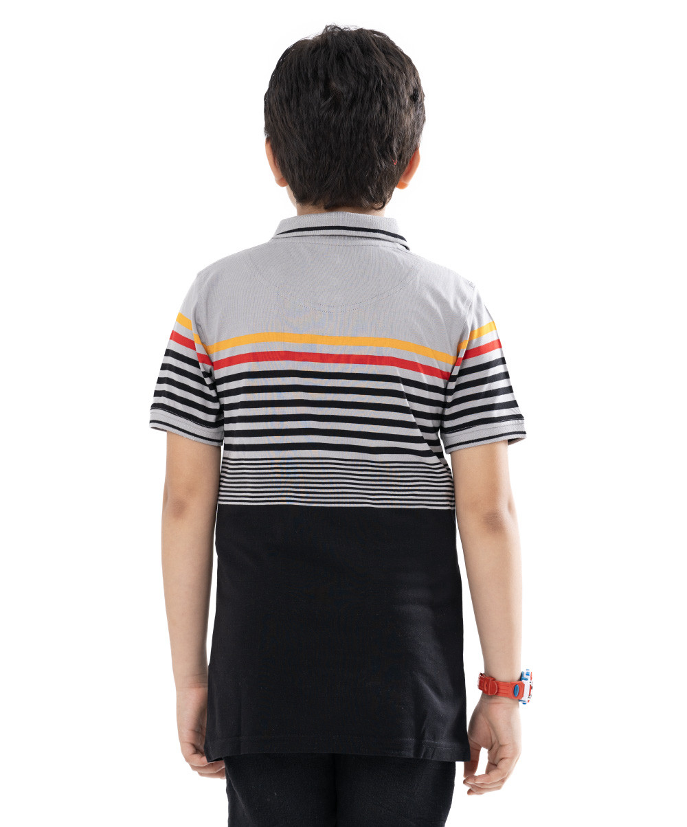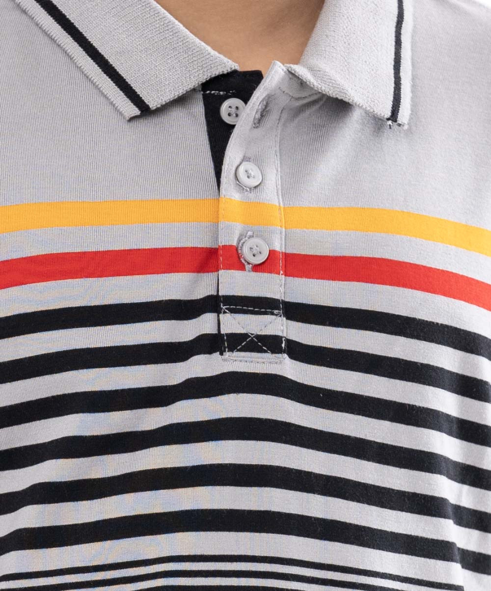 Introducing our "Gray and Black Stripe Polo in Cotton Single Jersey Fabric" – a stylish and comfortable addition to your wardrobe that effortlessly combines casual flair with a touch of sophistication. Crafted with care, this polo shirt is designed for those who appreciate both comfort and timeless style.
