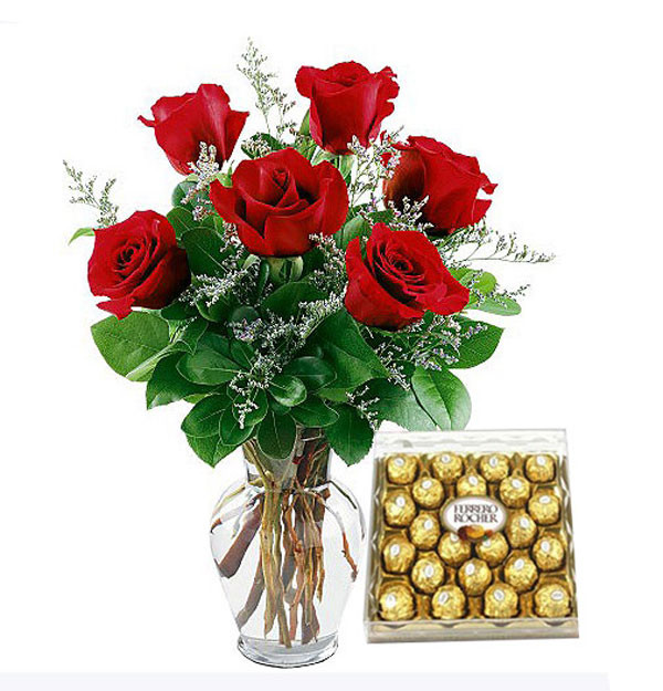 • Beautiful 6 Pcs Thai Red Roses in a Vase