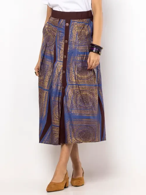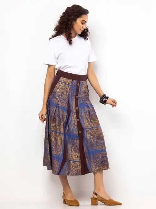 Introducing our elegant coffee linen Taaga skirt adorned with intricate blue and golden prints. This skirt features a zip opening on the left for added convenience and style. Crafted with high-quality linen, it offers both comfort and sophistication, making it suitable for various occasions. Elevate your look with this versatile and chic piece.