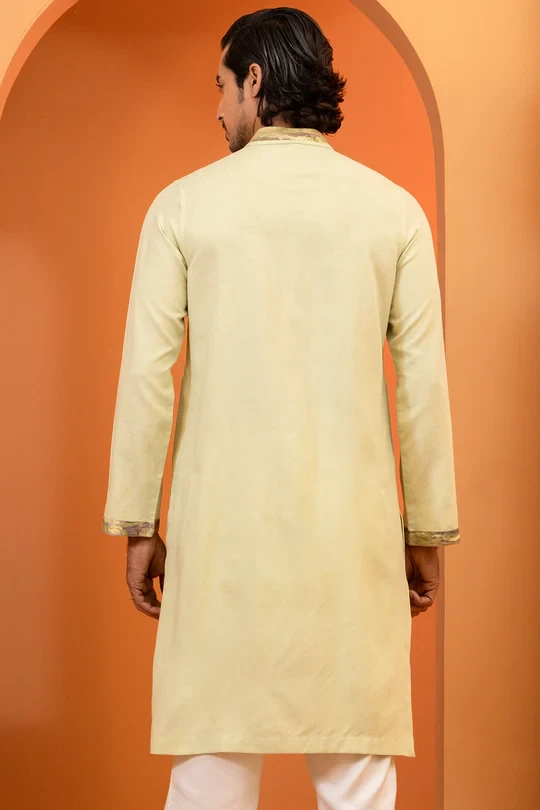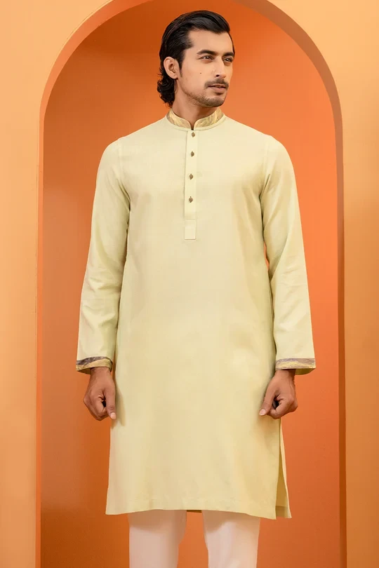Unleash your inner style icon with this Panjabi featuring a timeless mandarin collar and captivating contrasts. The Mandarin collar takes center stage with a touch of contrasting fabric on both the top and underside. For a touch of luxury, the placket and the top of the sleeves boast a beautiful tonal jacquard fabric, creating a dazzling contrast. The use of a contrasting dark thread for the buttonhole highlights the intricate details even more, while classic metal buttons on the placket complete the sophisticated look.