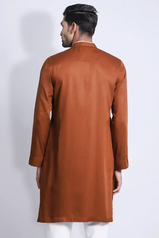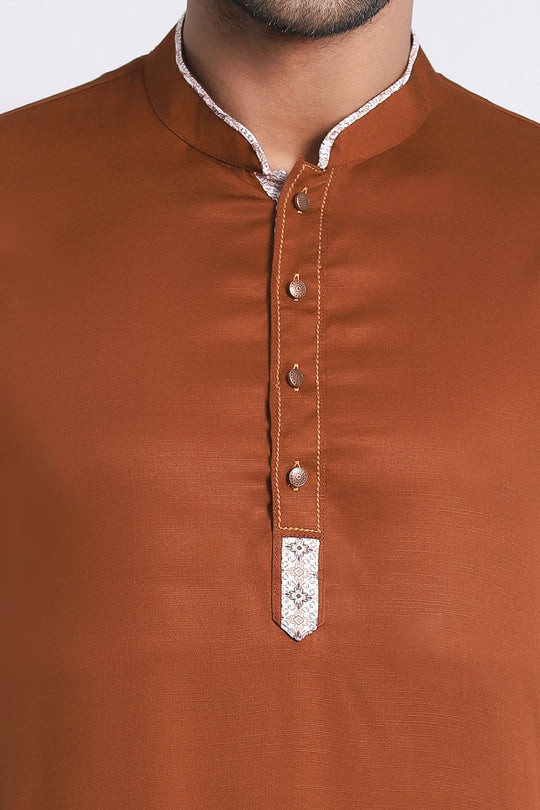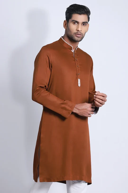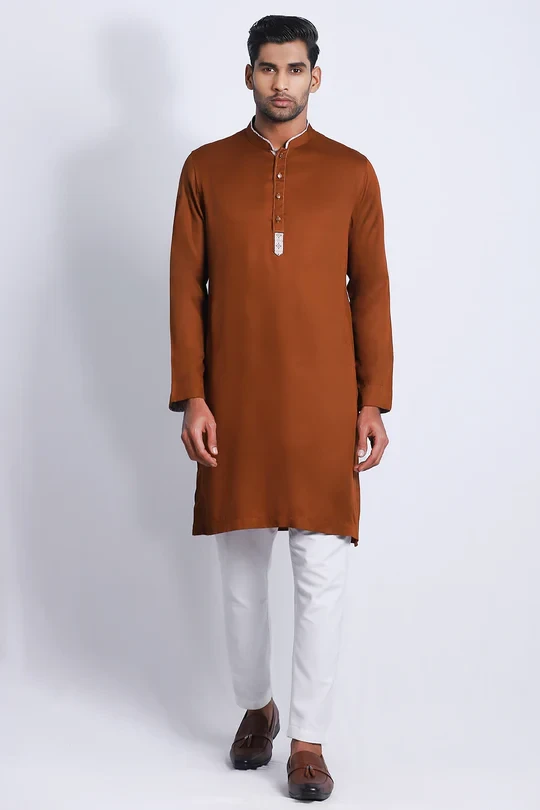 Infuse your traditional wear with a touch of modern edge with this sharp Regular Fit Cut & Sew panjabi. This meticulously crafted piece offers a comfortable and flattering regular fit, perfect for all-day wear. The placket features decorative metallic show buttons that add a touch of sophisticated flair, making it ideal for any special occasion.