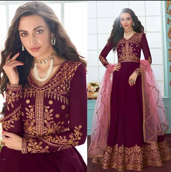 Dive into the essence of traditional elegance with this semi-stitched ensemble that radiates charm and sophistication. Crafted from soft georgette, this outfit showcases exquisite heavy embroidery that adorns the body and sleeves, creating a visual feast of intricate patterns.