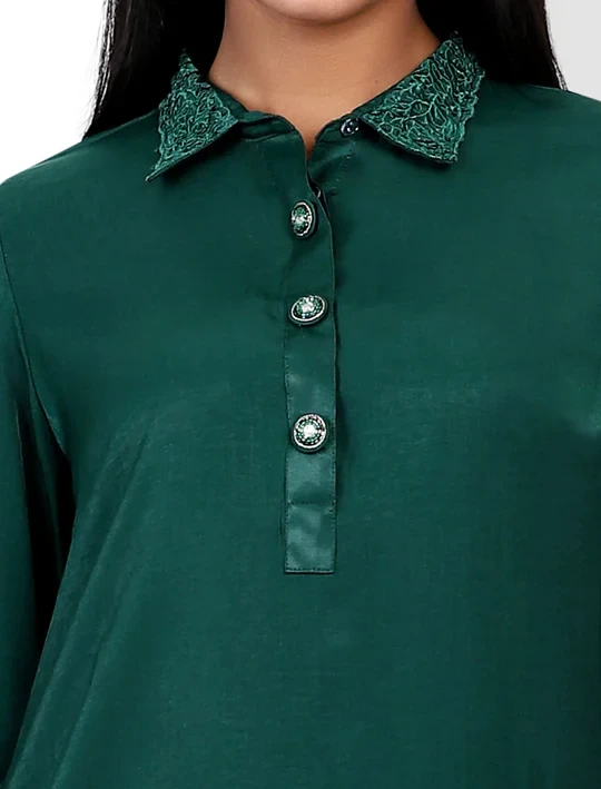 Introducing our Round Hem Kameez, a fusion of elegance and functionality. This stylish piece boasts a unique round hem design with the added convenience of side pockets for your essentials. The shirt collar features an exquisite embroidery panel that adds a touch of sophistication, while the Zardozi worked button serves as a luxurious accent. Completing the look, the sleeve's hem showcases intricate cut work, making this Kameez a perfect blend of fashion and practicality for any occasion.