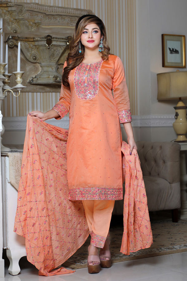 This embroidered stitched cotton Shalwar Kameez is a blend of traditional elegance and contemporary style. Made from premium quality cotton, it promises both comfort and durability. The kameez features intricate embroidery that adds a touch of sophistication, making it perfect for casual outings or festive occasions. The set includes a beautifully coordinated shalwar, complementing the overall look. Ideal for those who appreciate a mix of classic design with modern flair, this outfit is a must-have in your ethnic wardrobe.
