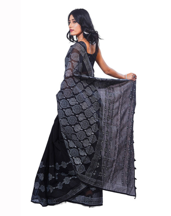 Every sharee needs meticulous attention to detail, including the fall and edging (pico border) work. These elements enhance its flow, grace, and durability. Edging is applied to both ends of the saree, ensuring a smooth finish and protecting against fraying. The fall, an inner cotton lining, extends along the first 3 meters of the saree, safeguarding the lower half from damage around the ankles.