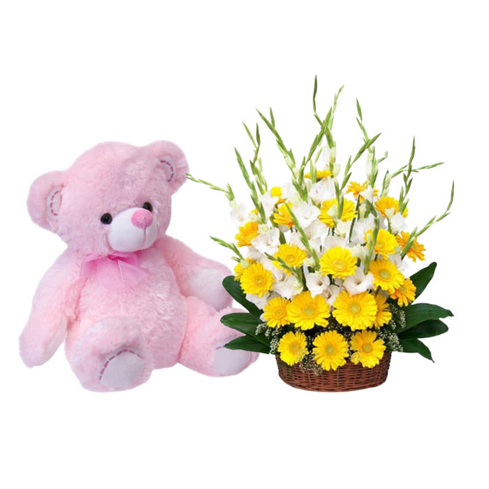 • 24 Pcs Beautiful yellow Gerbera and 16 pcs white Gladiola in a basket.