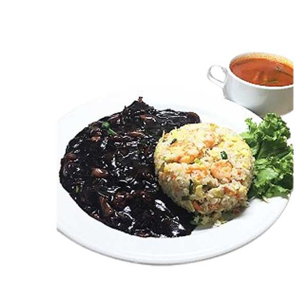 Shrimp Fried Rice with a thick sauce made of black bean sauce and vegetables. It served with spicy seafood soup.