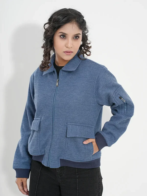 Introducing our Women Casual Jacket, a perfect combination of style and practicality. Made with textured waffle knit fabric, this jacket features a classic shirt collar, ribbed cuffs and hem, and a flap pocket with a zipped patch pocket on the left sleeve. Stay cozy and fashionable in this must-have piece.