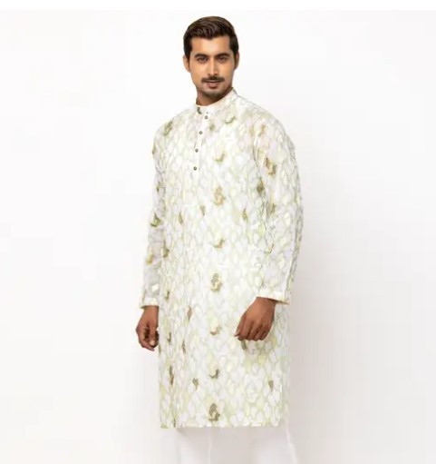 Introducing our White and Green Printed Viscose-Cotton Panjabi with Yellow and Olive Embroidery – a vibrant symphony of colors and textures for the modern gentleman. Crafted from a luxurious blend of viscose and cotton, this panjabi features an eye-catching white and green print that forms the backdrop for intricate yellow and olive embroidery, creating a uniquely stylish piece.