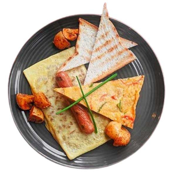 (Egg omelette with tomato, onion & mozzarella cheese, chicken sausage, bread & jam, egg fritatta, grilled mushroom)