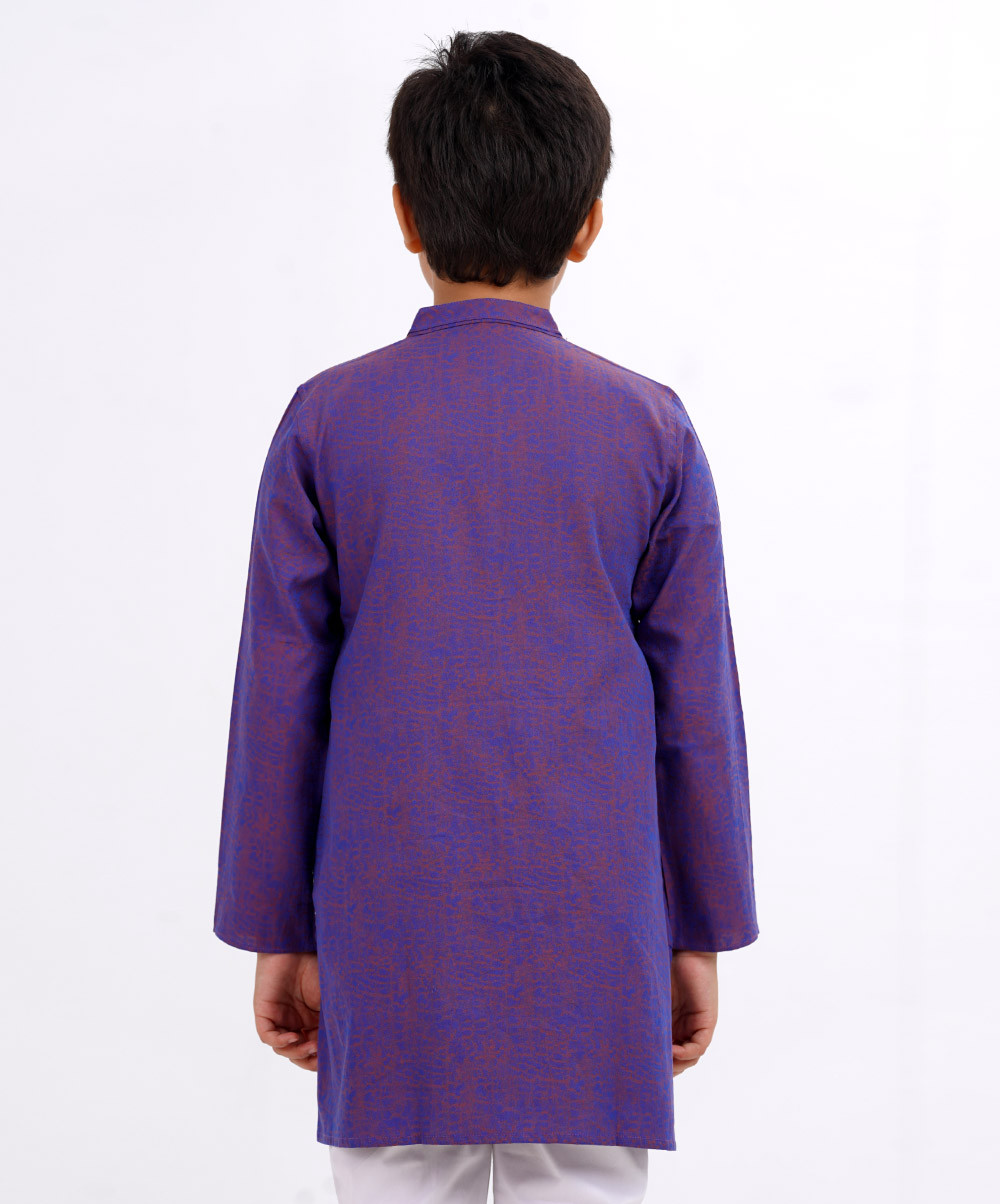 Blue Panjabi in two-toned Jacquard Cotton fabric. Designed with minimal karchupi on the collar and a hidden button placket. Available Size :2-3, 4-5, 6-7, 8-9, 10-11, 12-13. - Please indicate your desired product size / age in special instruction area of delivery information page. (4 - 5) Days Advance order is requird. A Product of La reve.