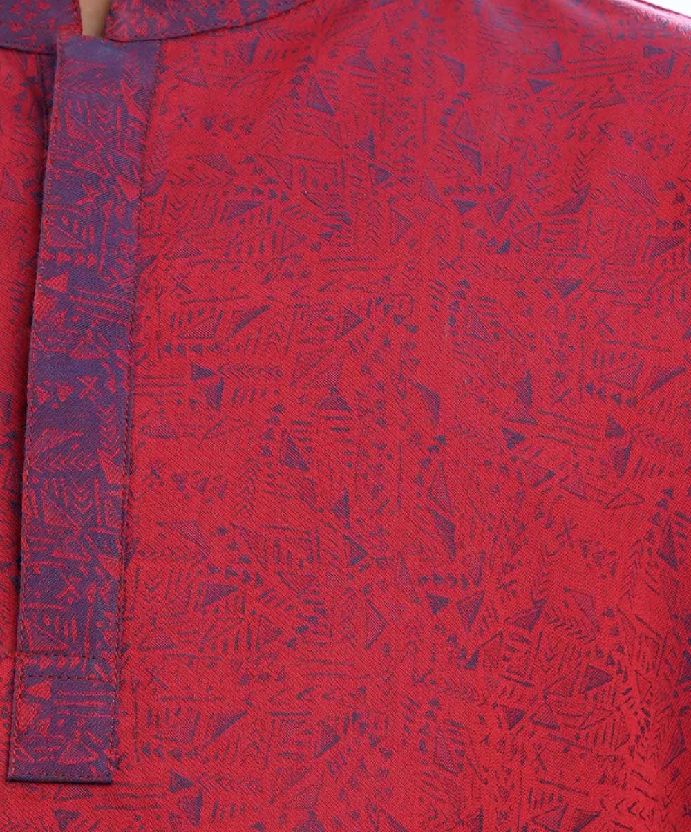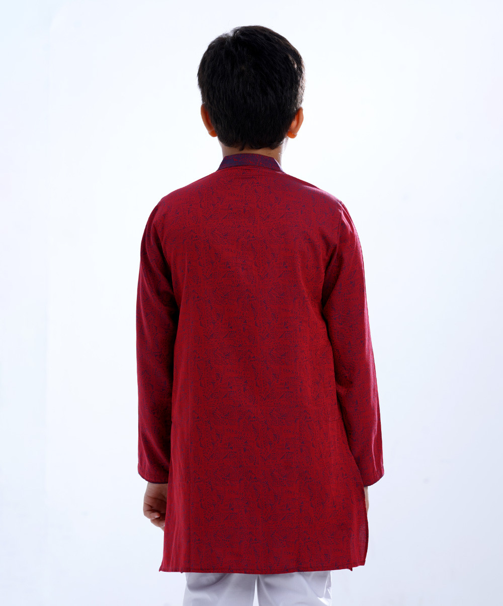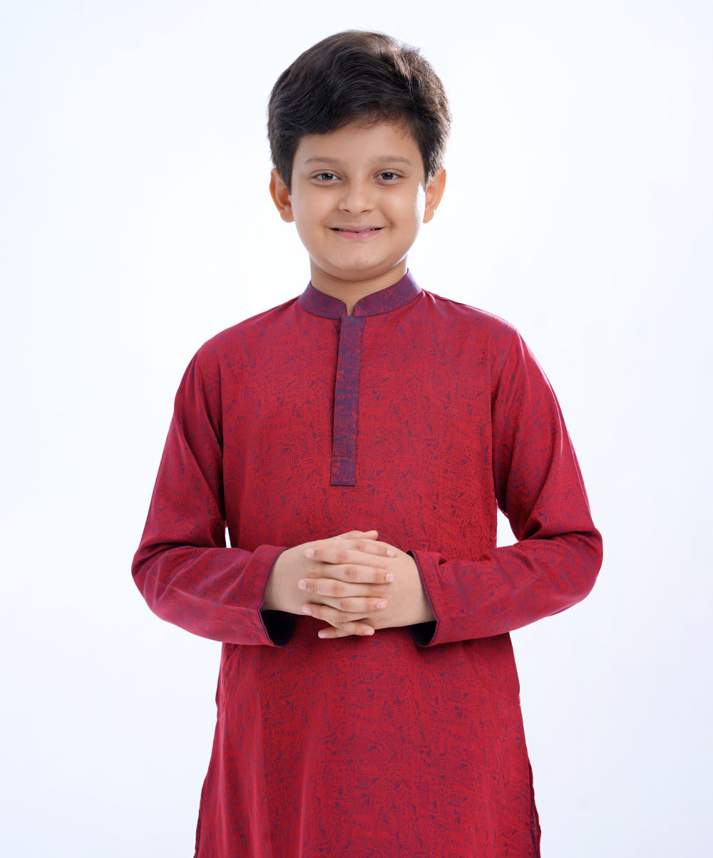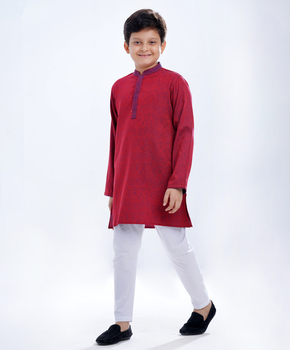 Red Panjabi in Jacquard Cotton fabric. Designed with a mandarin collar and hidden button placket. - Available Size :2-3, 4-5, 6-7, 8-9, 10-11, 12-13. - Please indicate your desired product size / age in special instruction area of delivery information page. (4 - 5) Days Advance order is requird. A Product of La reve. Available Size :2-3, 4-5, 6-7, 8-9, 10-11, 12-13. - Please indicate your desired product size / age in special. instruction area of delivery information page. (4 - 5) Days Advance order is requird. A Product of La reve.