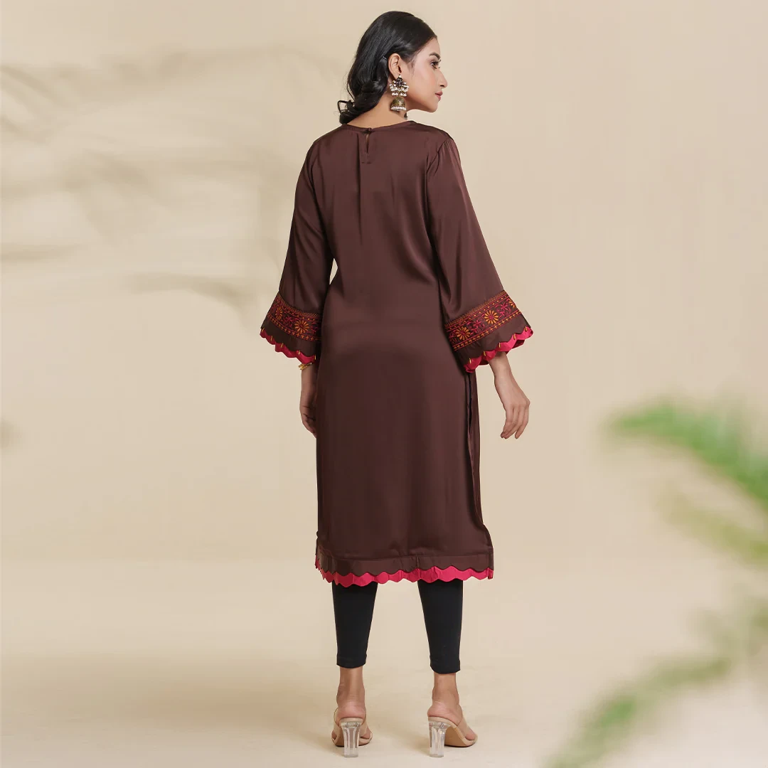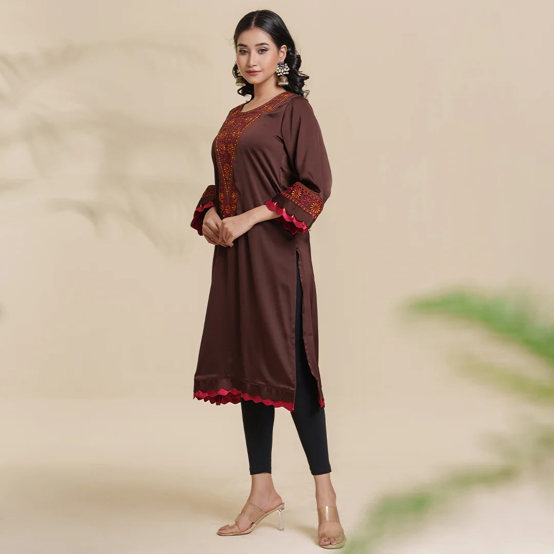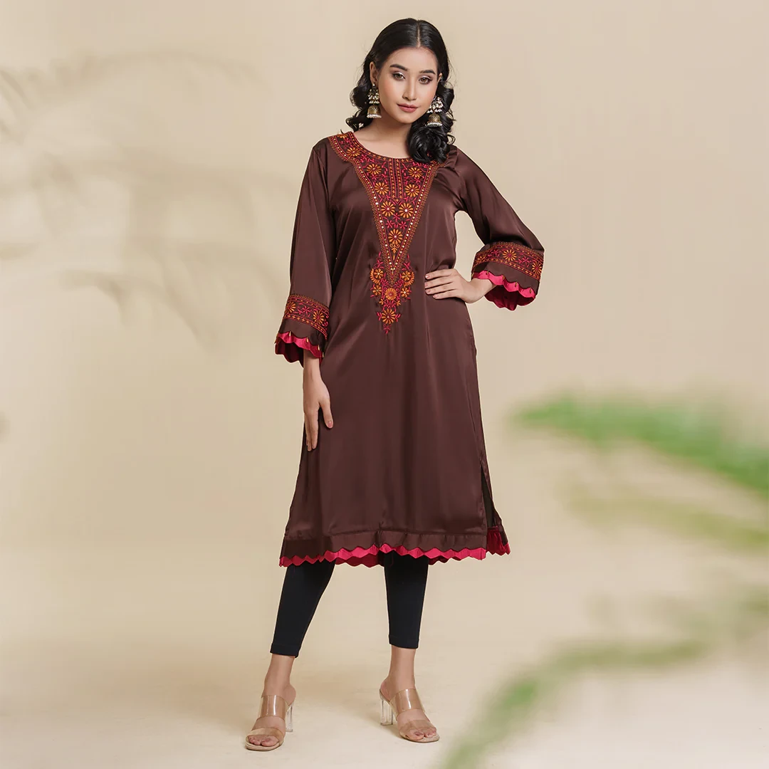This stylish kurti for women features a luxurious georgette fabric and a beautiful border lace, with an all-over print to create a unique and eye-catching ethnic fusion look. Perfect for any special occasion, this kurti is sure to make a statement.