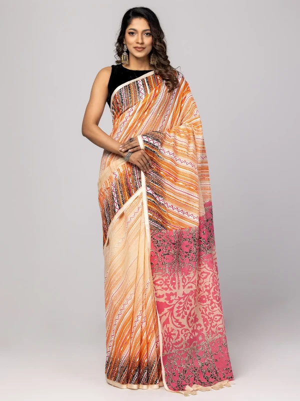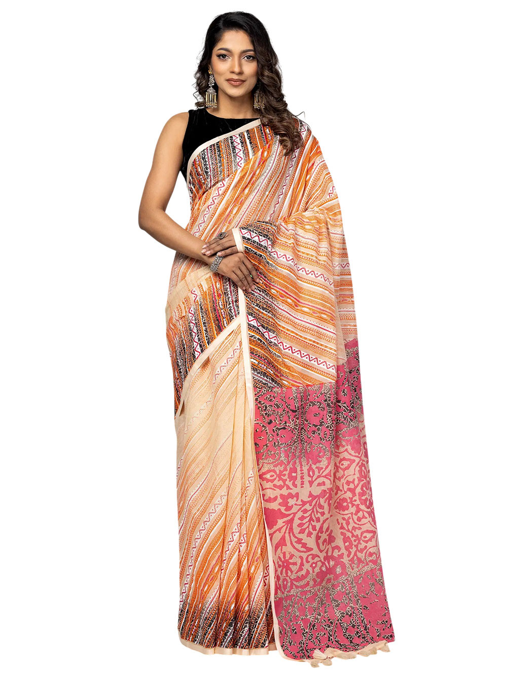 Light beige cotton saree with red, orange, black and white prints. Comes with matching unstitched blouse piece attached at the end of saree. Blouse shown in the photo is a styling suggestion, it is not a part of the actual product.