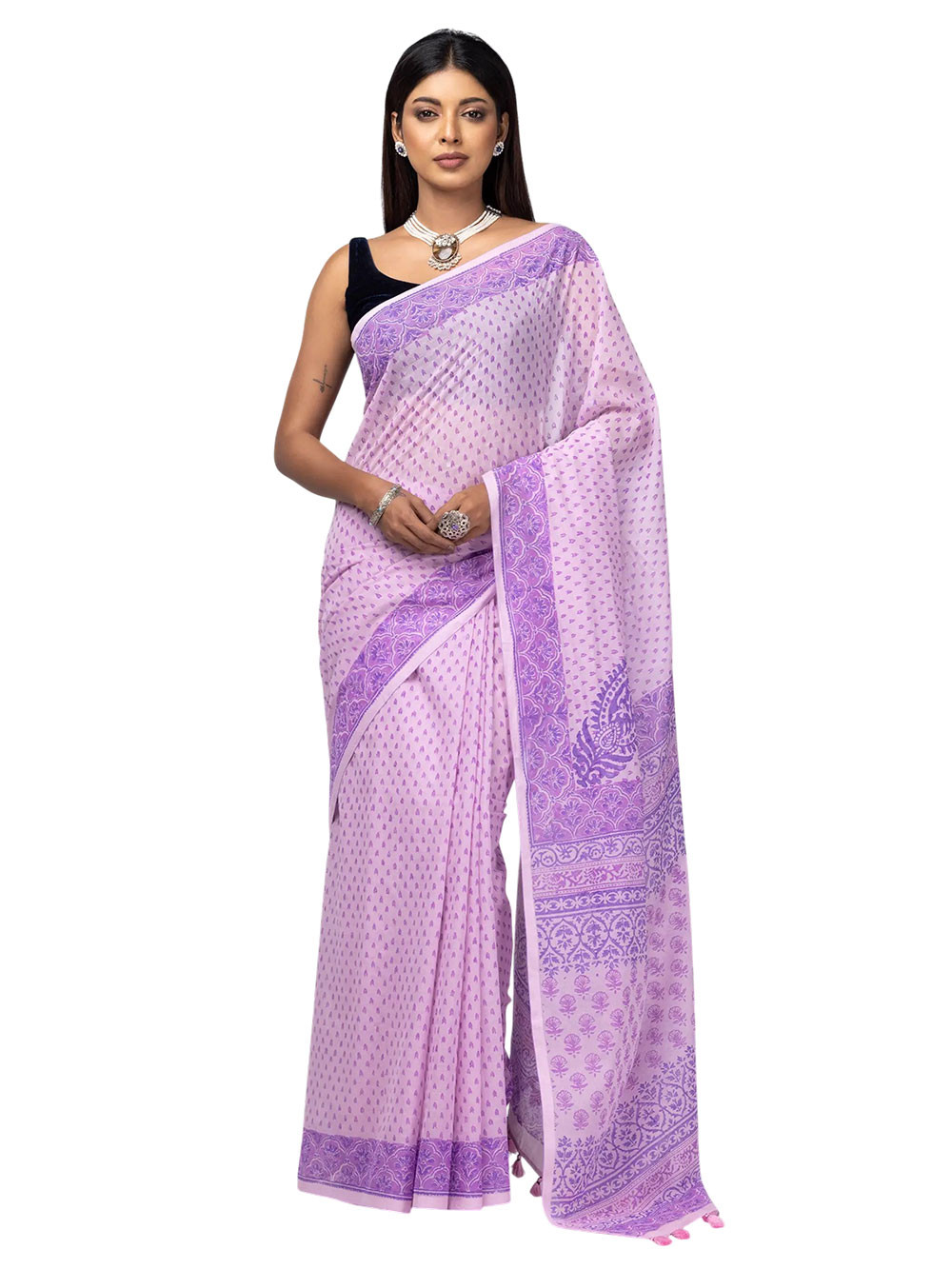 Light pink cotton saree with purple prints. Comes with matching unstitched blouse piece attached at the end of saree. Blouse shown in the photo is a styling suggestion, it is not a part of the actual product.