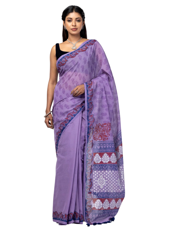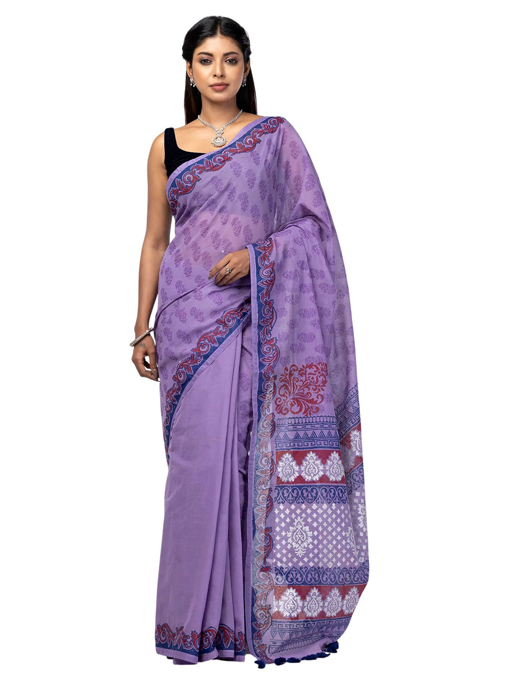 Light purple cotton saree with purple, blue and burnt orange prints. Comes with matching unstitched blouse piece. Blouse shown in the photo is a styling suggestion, it is not a part of the actual product.
