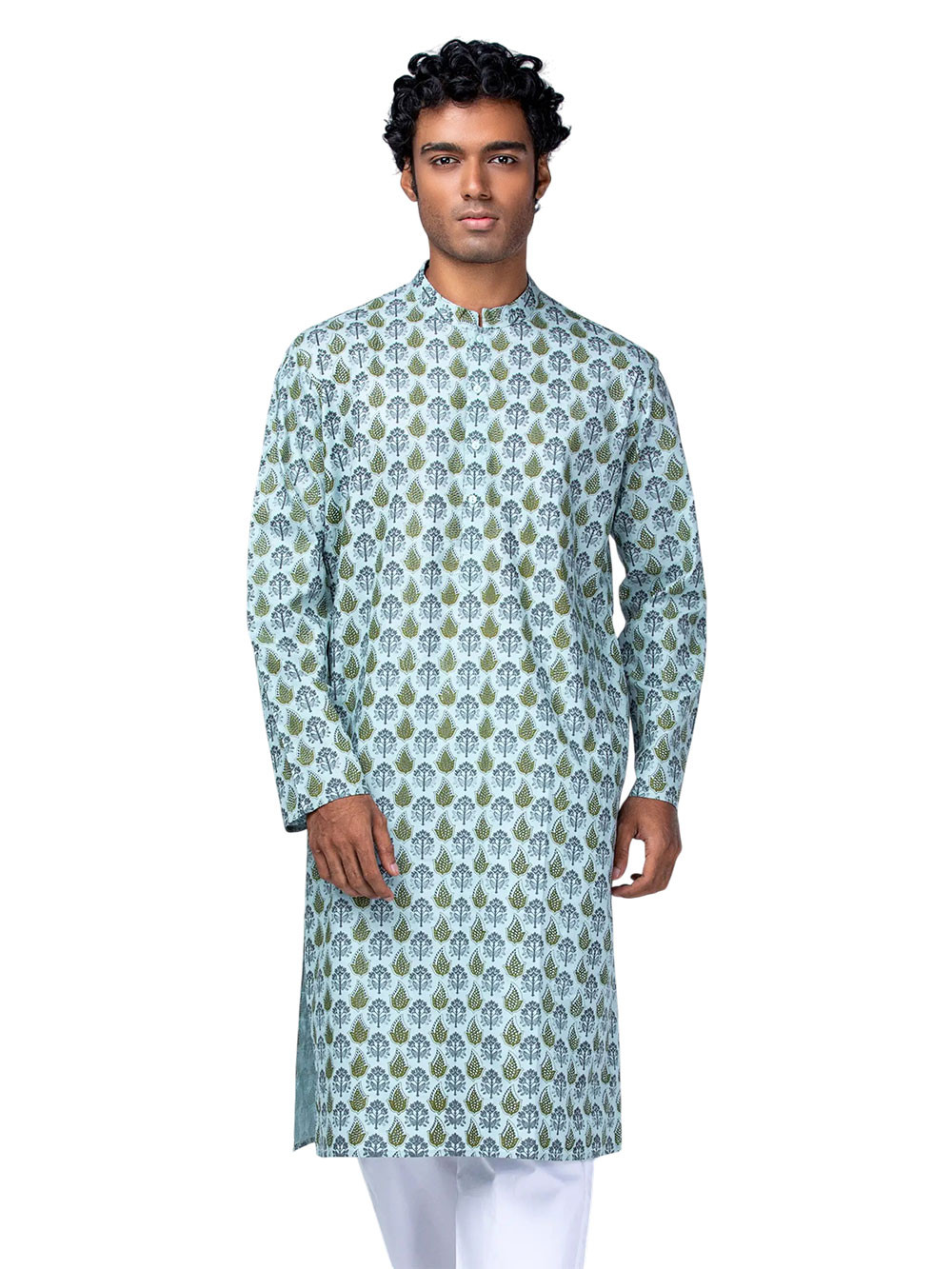 Light sky blue viscose-cotton panjabi with olive and slate blue prints. Features in-seam side pockets.