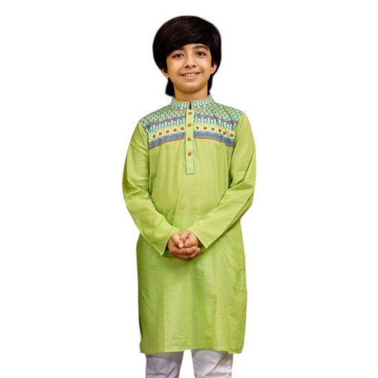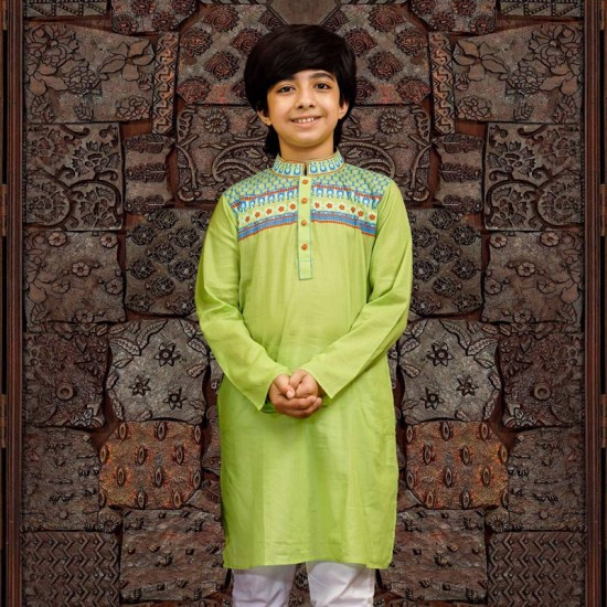 Kids Panjabi - Lime green color cotton printed boys Panjabi
