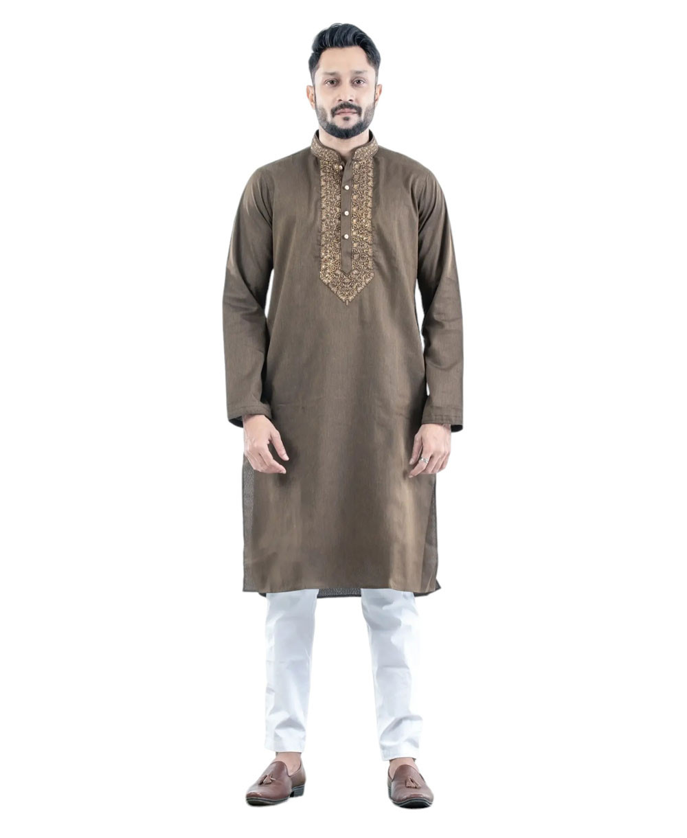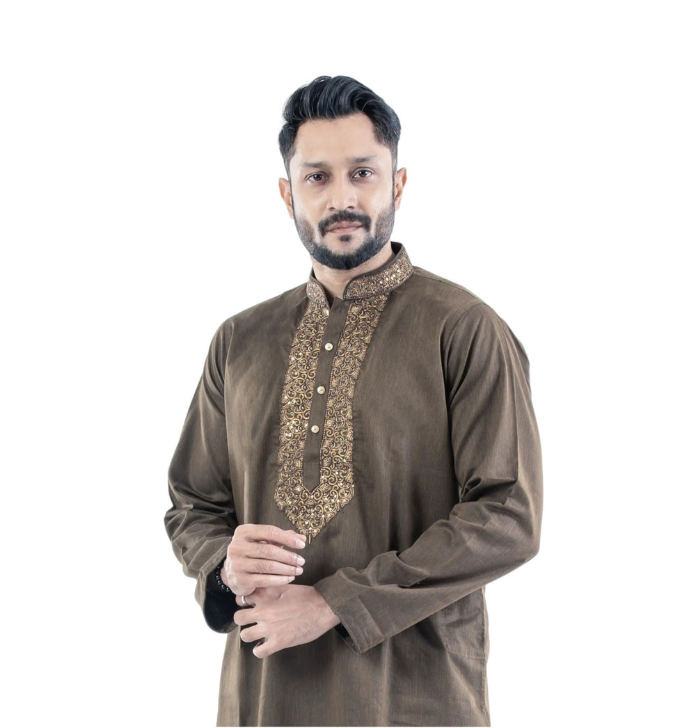 Introducing our Cotton Panjabi, a harmonious blend of comfort and style. This Panjabi features intricate screen-print designs complemented by exquisite embroidery work, creating a look that's both traditional and contemporary. Made from high-quality cotton, it ensures breathability and comfort, perfect for any occasion. Whether for festive events or casual outings, this Panjabi adds a touch of elegance to your wardrobe. Embrace the perfect combination of cultural heritage and modern flair with this beautifully designed piece.