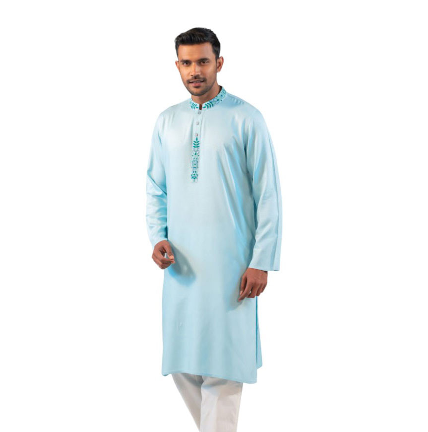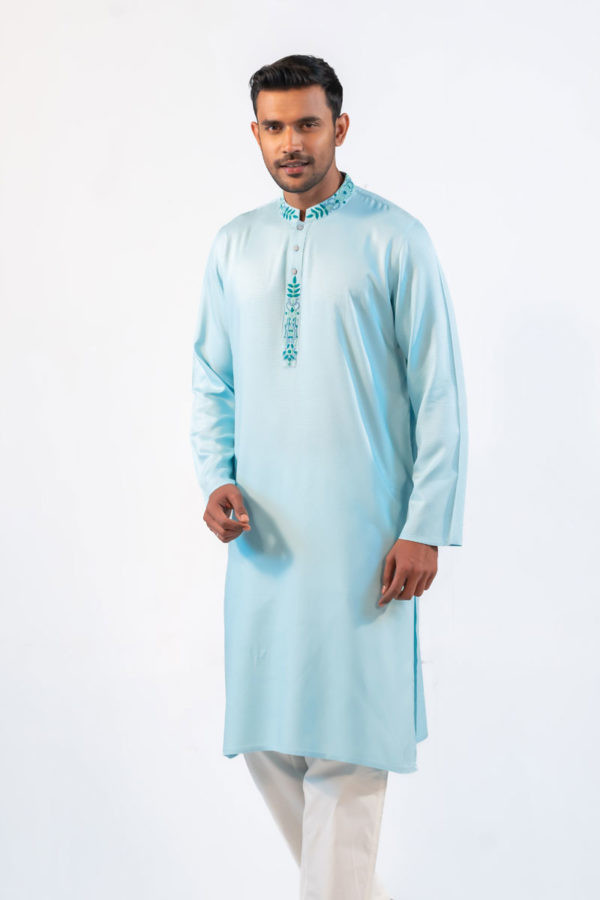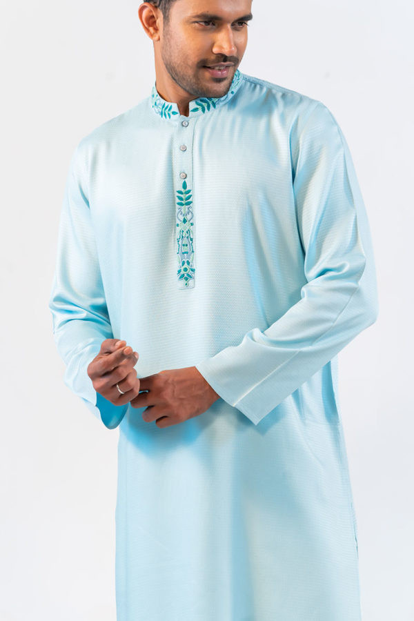 Long Panjabi - Mineral Ice Jacquard Cotton Embroidered Panjabi