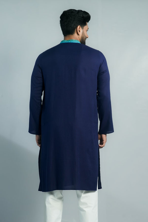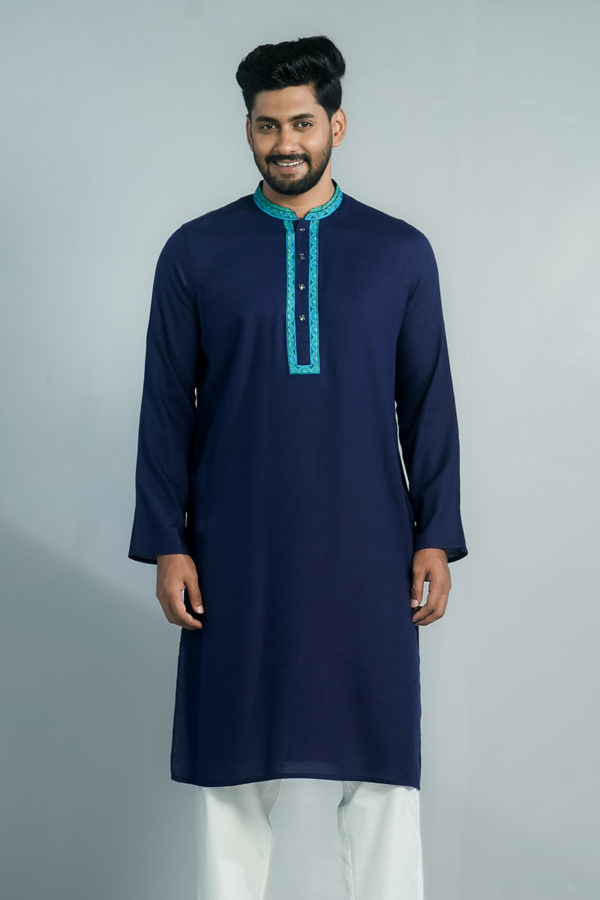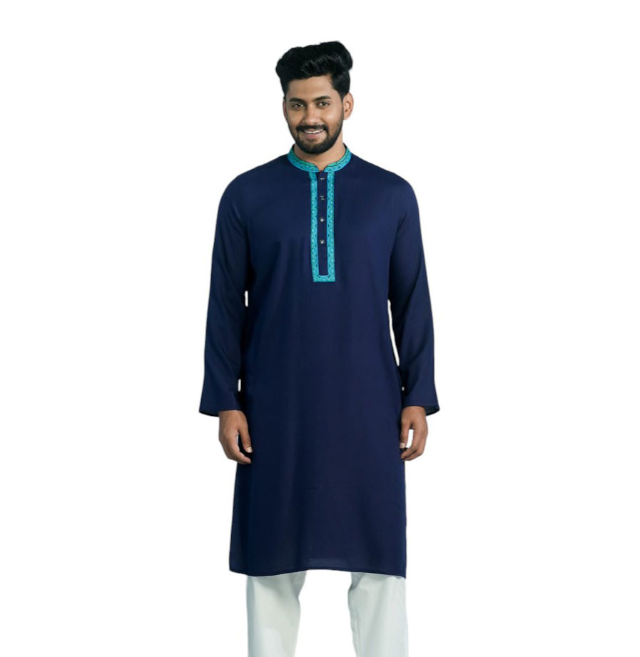 Long Panjabi - Navy Blue Jacquard Cotton Karchupi Ornamented Panjabi