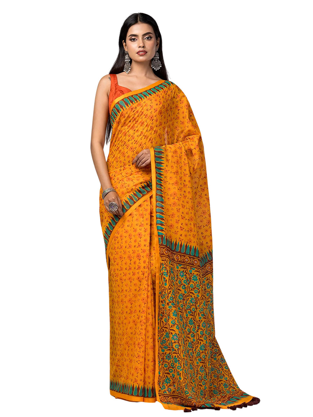 Orange cotton saree with brown, dark orange and turquoise prints. Comes with matching unstitched blouse piece attached at the end of saree. Blouse shown in the photo is a styling suggestion, it is not a part of the actual product.