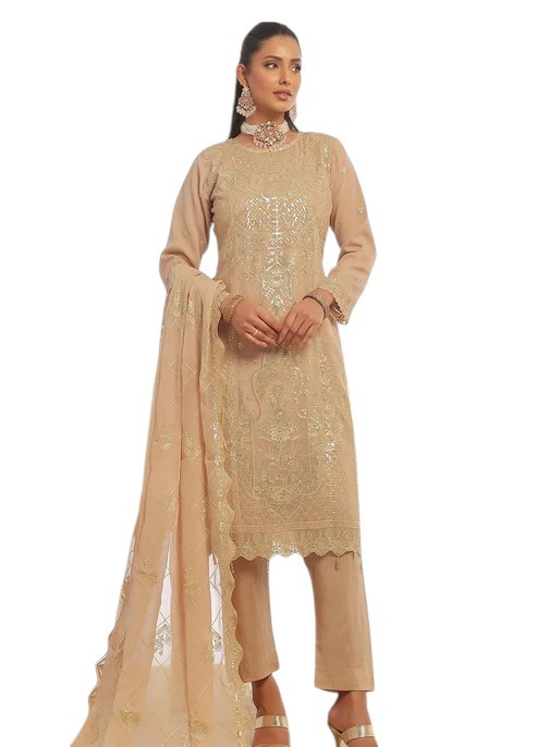 Elegant and timeless, this Pakistani luxury semi-stitched 3-piece set features intricately embroidered chiffon fabric. Perfect for festive and formal occasions, it includes a beautifully detailed top, matching bottom, and a graceful dupatta, combining traditional charm with modern sophistication.