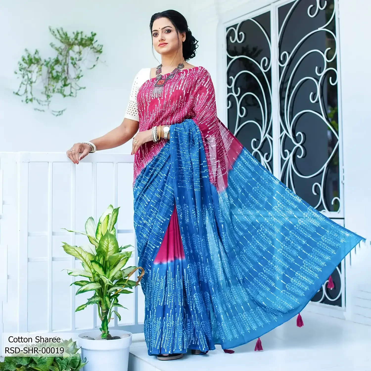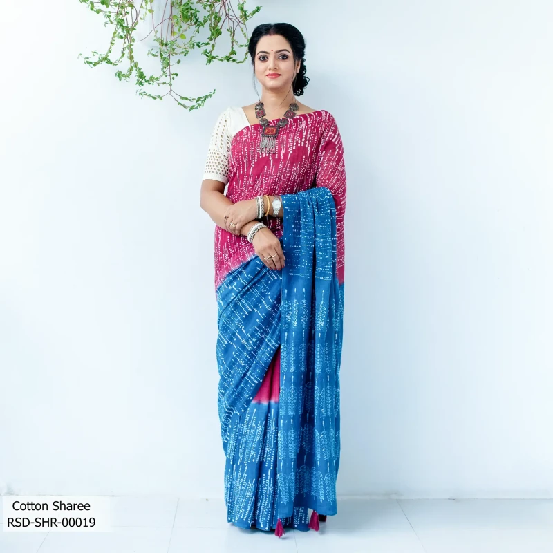 Introducing our exquisite slub-cotton Sharee, adorned with intricate screen-print and handwork detailing, designed to elevate your ethnic wardrobe with effortless elegance. Crafted from high-quality slub-cotton fabric, this Sari boasts a luxurious texture and comfortable feel, perfect for all-day wear. The delicate screen-print adds a touch of sophistication, while the handwork detailing adds a hint of artisanal charm. Whether it's a festive celebration or a formal event, this Sari is sure to make you stand out with its unique blend of traditional craftsmanship and contemporary style. Embrace timeless beauty with our slub-cotton Sari and make a statement with every step.
