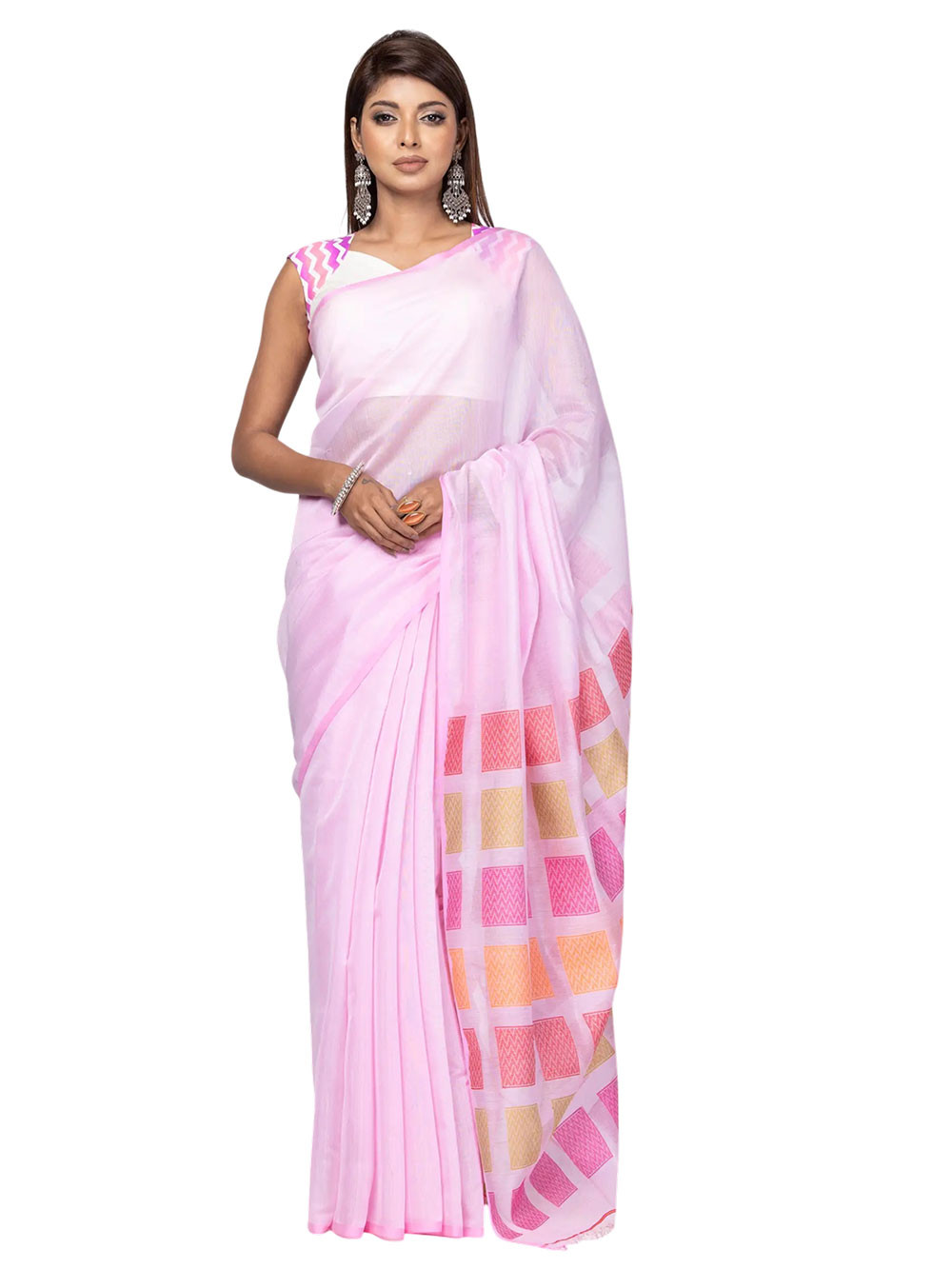 Pink Tangail half silk baluchari saree with magenta, orange, green and red weaving details. Unstitched blouse piece attached at the end of saree. Blouse shown in the photo is a styling suggestion, it is not a part of the actual product.