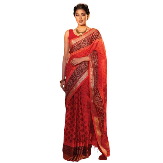 Red color printed & embroidered Aachol,Red color full body printed cotton Shari with, Red color coton printed blouse piece.