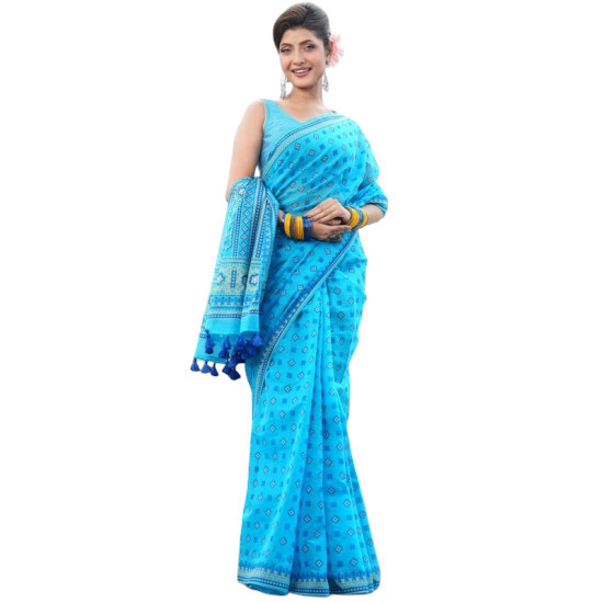 Teal blue color printed & embroidered cotton shari with Teal blue color printed blouse piece.