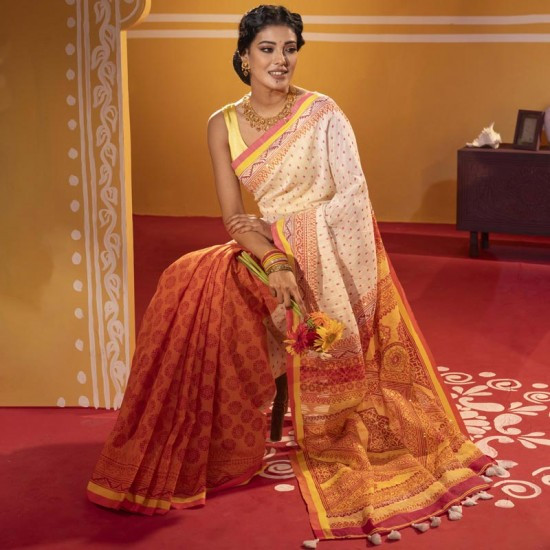 Yellow color printed & embroidered Aachol, Orange & Off white full body printed cotton silk Shari with yellow color blouse piece.