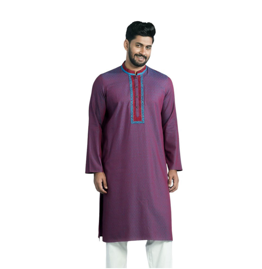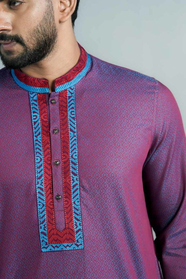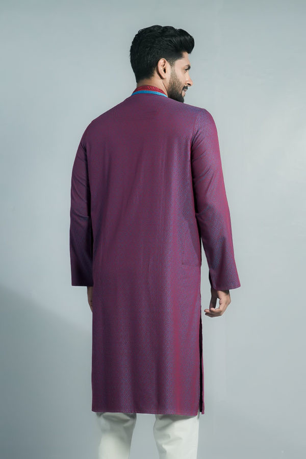 Long Panjabi - Raspberry Jacquard Cotton Embroidered Panjabi
