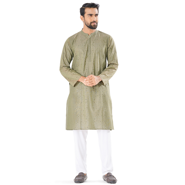 Green Semi Fitted Cotton Panjabi. Available Size : 38 - 40 - 42 - 44 . - 5 days advance order is required. Same day Order Not Accepted. Please do not use any discount coupon for this product. No Refund or exchange available for this item. A Product of Le Reve.