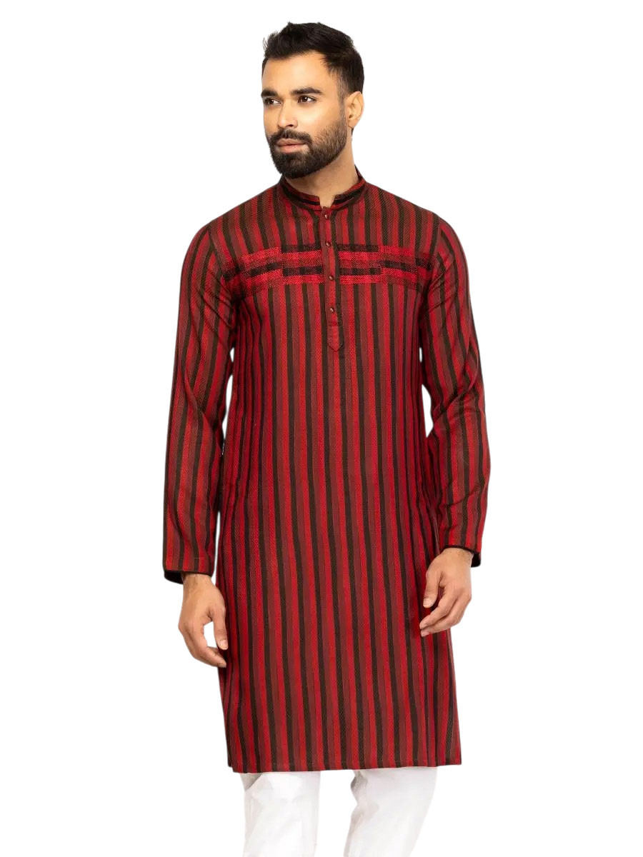 Red, maroon and black striped viscose-cotton slim fit panjabi with embroidery. Features in-seam side pockets.