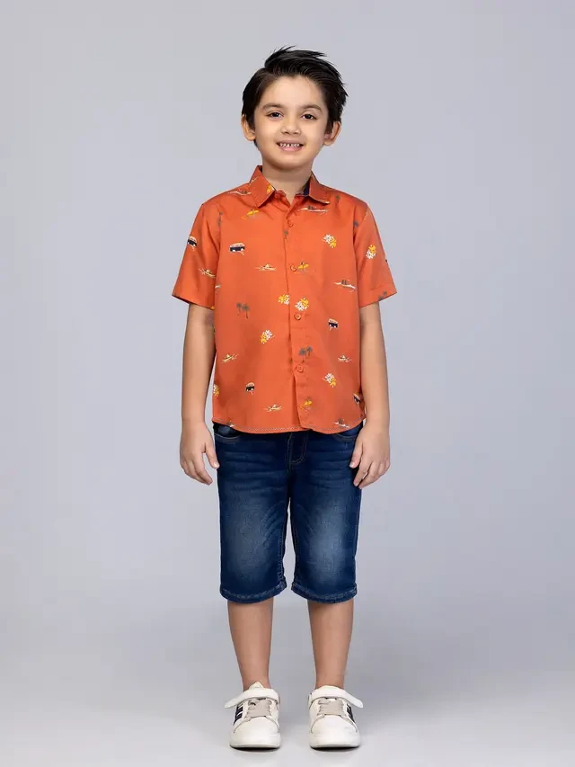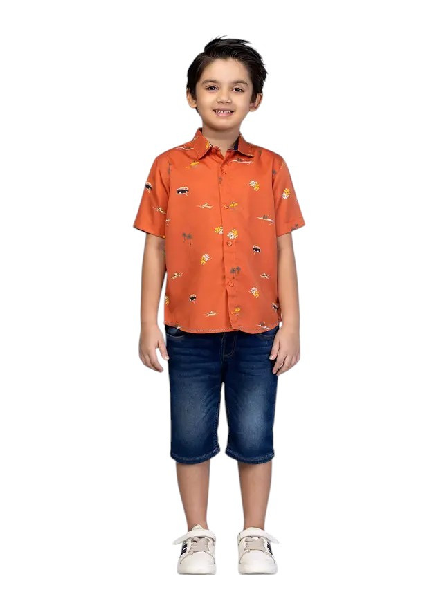 Toddler Boy - Rust Printed Mixed Cotton Shirt