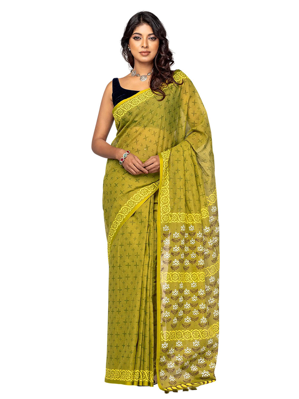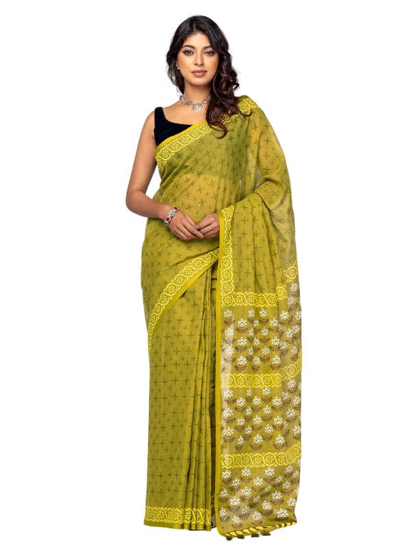 Sage green cotton saree with green and yellow prints. Comes with matching unstitched blouse piece. Blouse shown in the photo is a styling suggestion, it is not a part of the actual product.