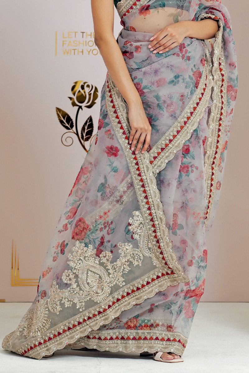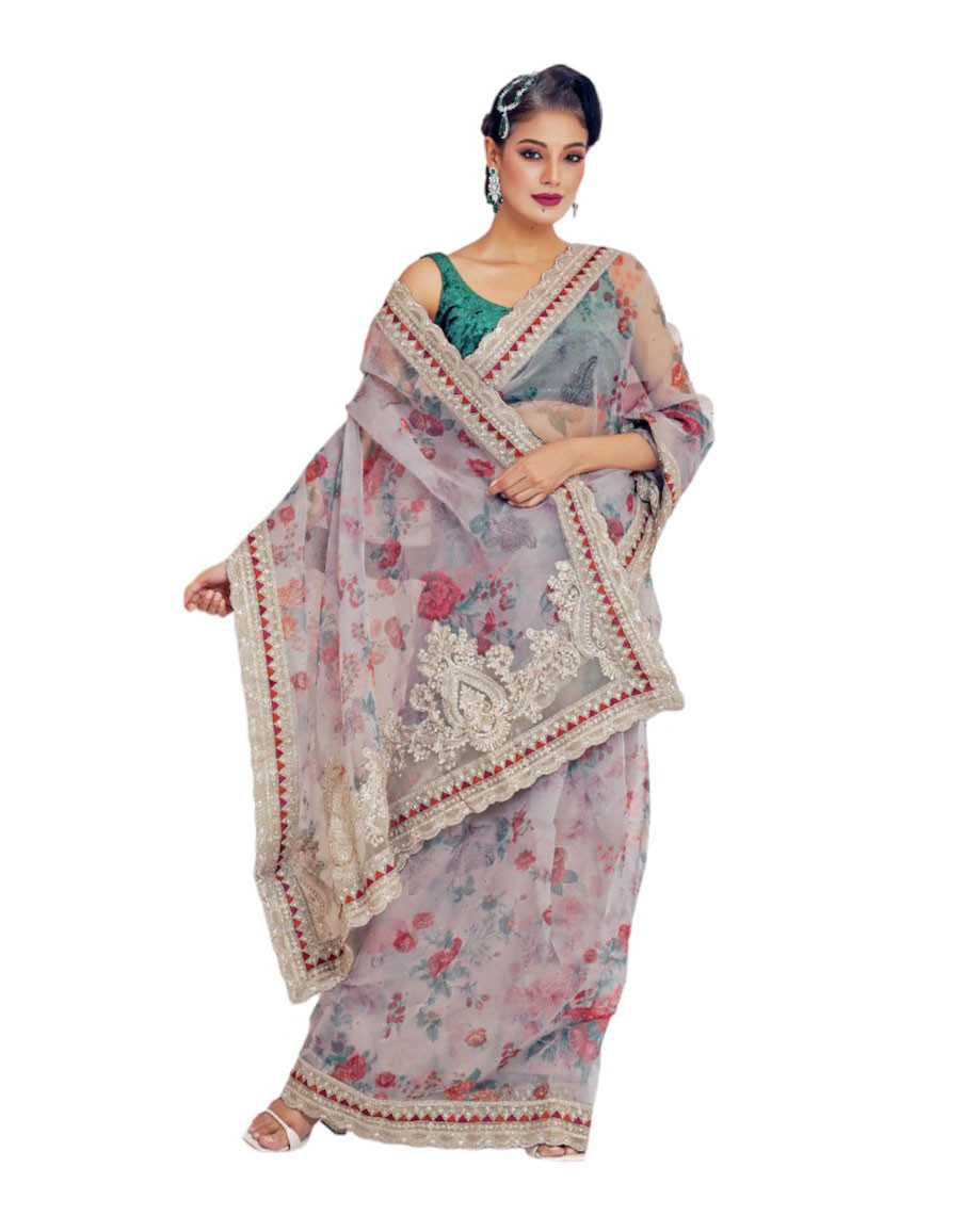 Screen Printed Jari Embroidered Muslin Sharee For Women