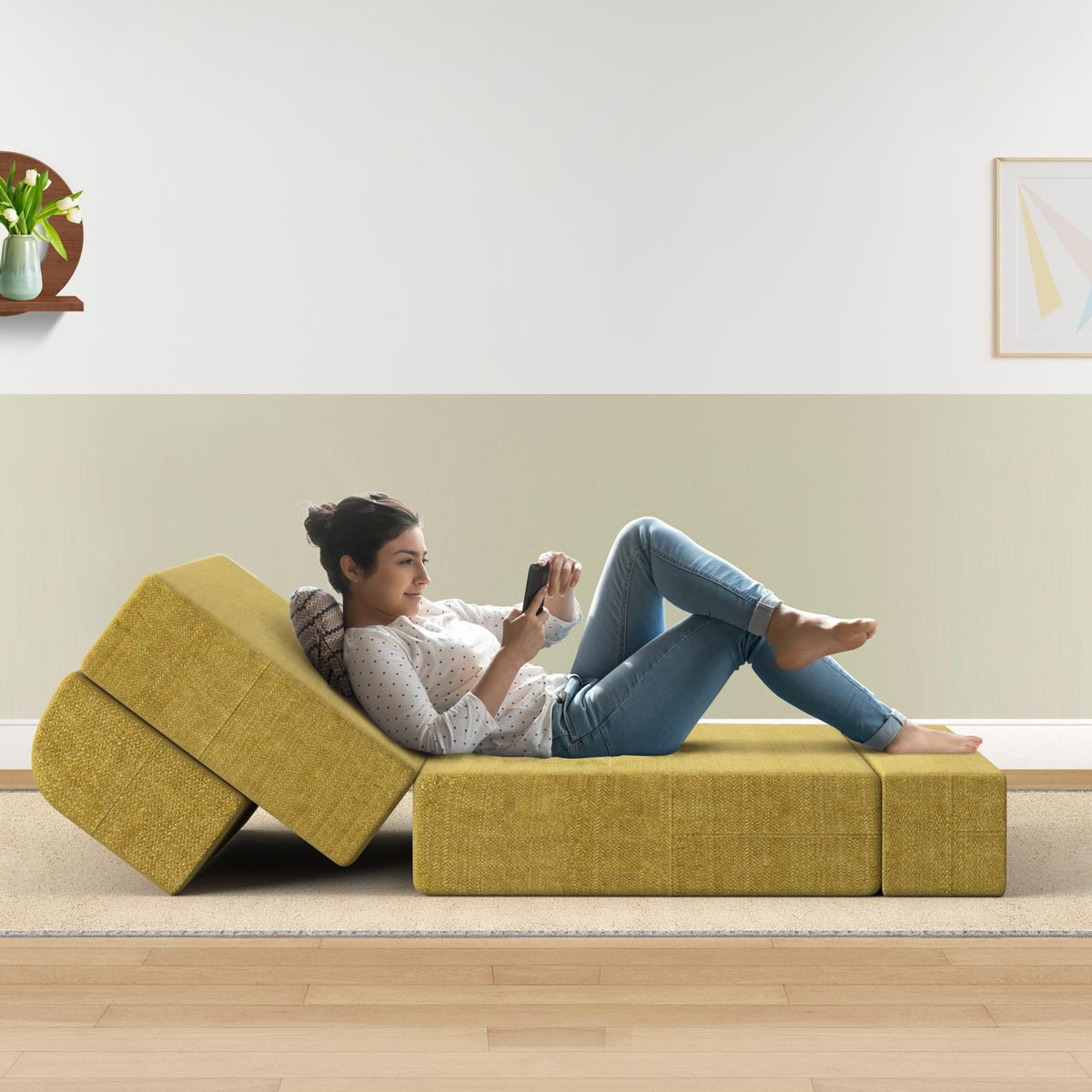 Designed for efficiency, the sofa bed is soft, comfortable and easy to set up. You would be surprised that this lightweight yet sturdy piece of furniture has quite a few uses the ideal solution for saving space with minimal effort and time, the unit is functional with its sleek appearance and helps you maintain a clutter-free home. Besides a Bed/Sofa, you can use this as a Lounger for watching movies and a study on the floor table too.