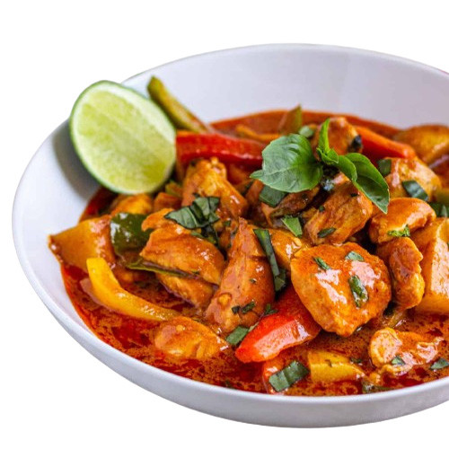 • Boneless Sliced chicken cooked with creamy Thai red curry sauce & low fat milk.