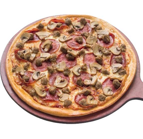 • Topped with beef pepperoni, beef, spicy chicken, chicken, onions, mushrooms, capsicum & black olives.
