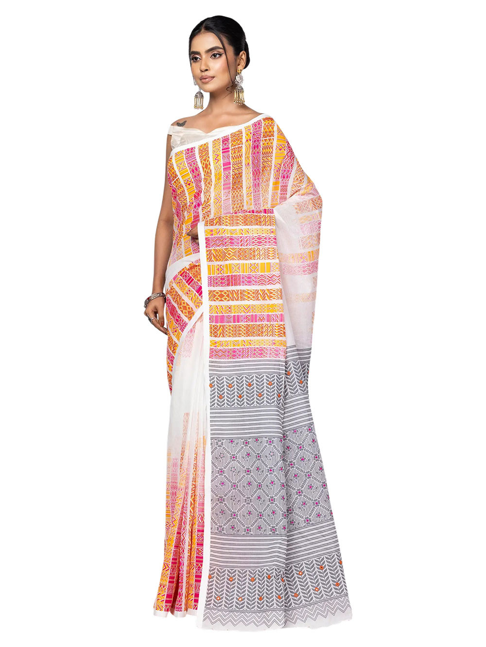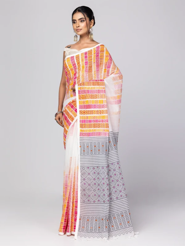 Sharee - White Brush Painted and Printed Cotton Sharee