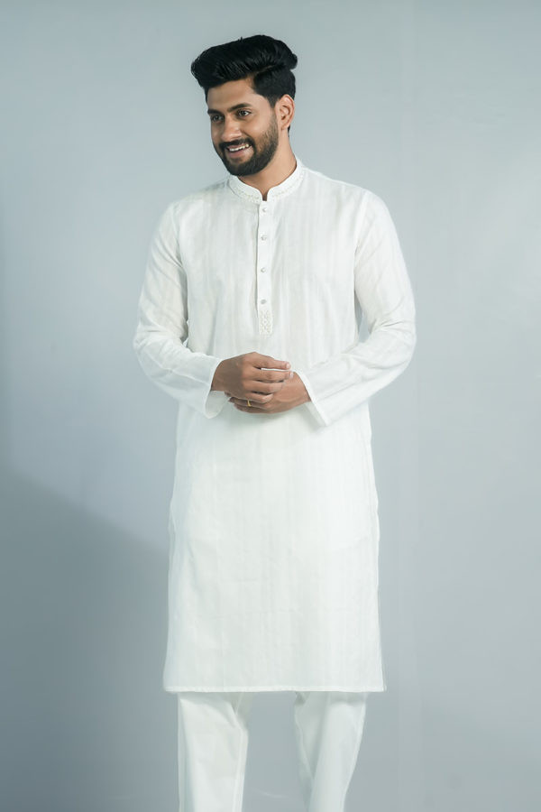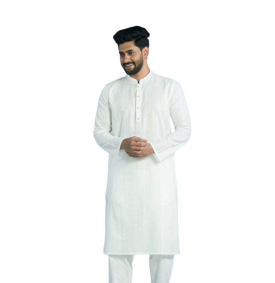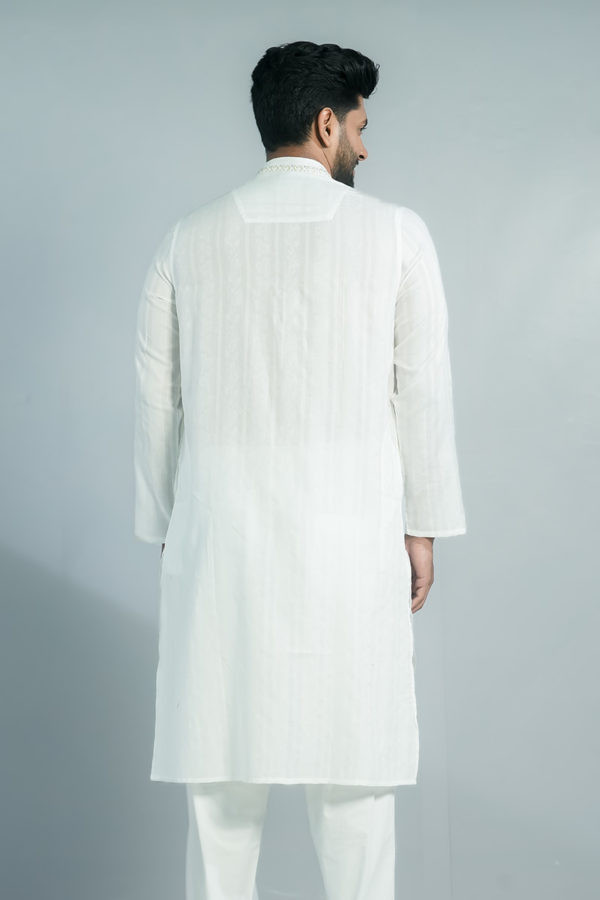 Long Panjabi - White Jacquard Cotton Embroidered Panjabi