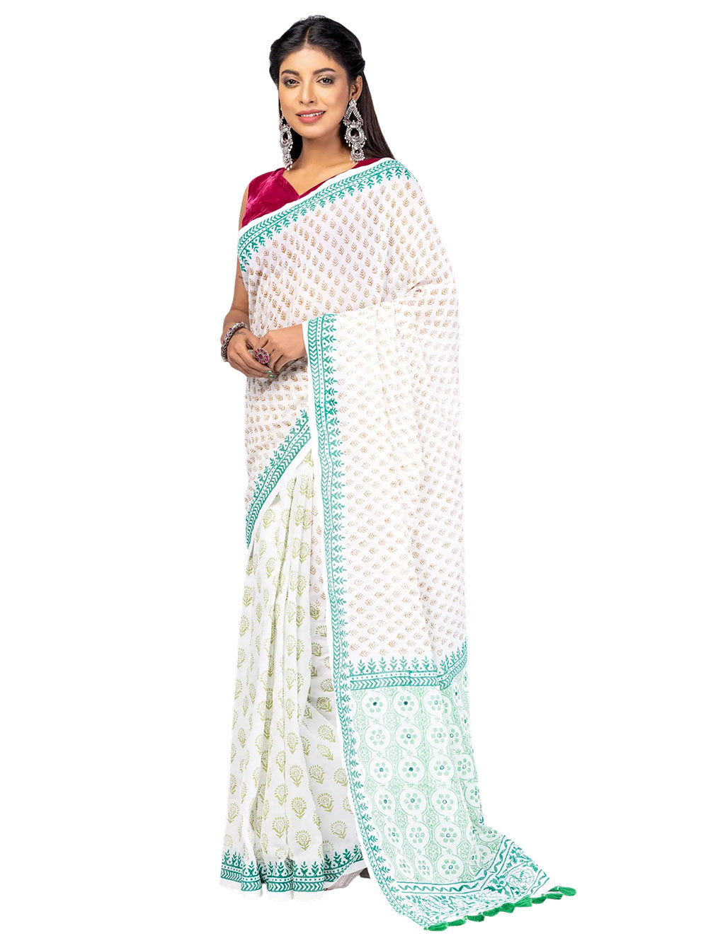 White cotton saree with brown, green and teal prints. Comes with matching unstitched blouse piece. Blouse shown in the photo is a styling suggestion, it is not a part of the actual product.